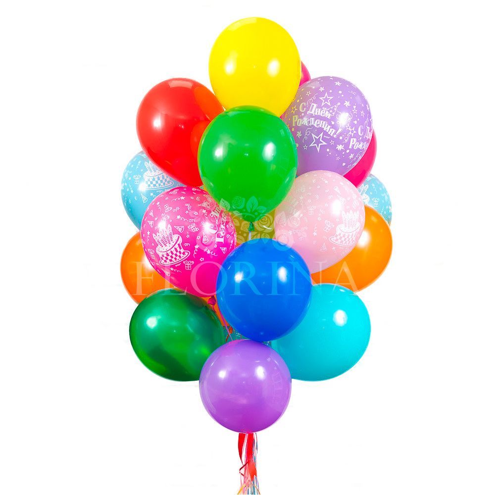 Набор включает в себя яркие разноцветные шары и шары "С Днем Рождения"