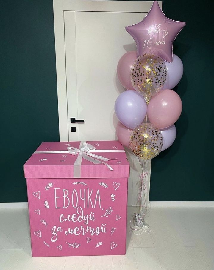 • Большая розовая коробка-сюрприз с трогательной надписью "Евочка, следуй за мечтой" — подарок, который сам по себе является украшением.